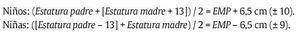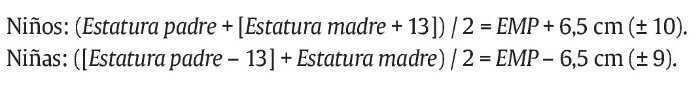 Por otro lado, la correlación entre la estatura media de los padres y la estatura del hijo (expresada en centímetros) es de 0,75 - 0,78 y expresada en desviaciones estándar la DE es de 0,55 - 0,6037entre los 2 y 9 años. Existen tablas de correlación entre la estatura media de los padres (estatura materna + estatura paterna /2) (EMP) y la estatura del niño entre 2 y 9 años descritas por Tanner, Goldstein, Whitehouse38. En este sentido, para calcular la estatura del hijo de una determinada pareja de esposos, asumiendo que el proceso de herencia fue normal y que los factores ambientales han influido de forma similar en ambas generaciones, el método más usado es el propuesto por Tanner:
