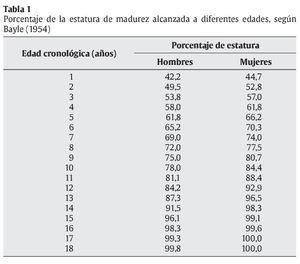 Su valoración puede efectuarse a través de los valores expresados en porcentaje que se alcanza a determinada edad. Bayley34 elaboró un cuadro que permite pronosticar con cierta seguridad la futura estatura de un individuo a partir de las mediciones individuales tomadas durante la niñez (tabla 1). Algunos estudios en gemelos sugieren que la estatura es un continuo rasgo complejo en el que sugieren que el 80-90% es heredable35,36. La previsión de la estatura definitiva prevista (EDP) se obtiene a partir de la siguiente fórmula: