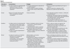 Los indicadores más usados para valorar la maduración biológica son a partir de los caracteres sexuales secundarios, edad esquelética y PVC (Malina, Bouchard, Bar-Or2), (tabla 2). Cabe destacar que la edad dental es también considerada como otra técnica muy amplia y de limitada aplicación, a pesar de que su uso es relevante para los odontólogos en general, ortodoncistas y pediatras en relación a las decisiones terapéuticas45.