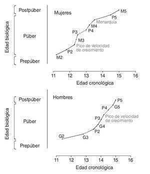Algunos estudios consideran que la maduración sexual se correlaciona muy bien con el crecimiento lineal, cambios en el peso y la composición corporal y con los cambios hormonales59, lo que permitiría estimar el momento del crecimiento esquelético del adolescente60, puesto que la osificación y calcificación del esqueleto durante la adolescencia llega a su término a los 17-20 años61.