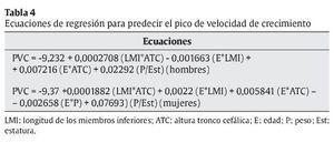 Pico de velocidad de crecimiento. Esta técnica es propuesta por Mirwald et al7, en la que es necesario medidas antropométricas como peso, estatura, altura tronco cefálica (estatura sentado) y la diferencia entre la estatura y la altura tronco cefálica. Es considerada como práctica y no invasiva15 y permite predecir la proximidad y el alejamiento del PVC en años desde -4, -3, -2, -1, 0, 1, 2, 3, donde cero (0) significa el PVC. Las ecuaciones de regresión para ambos sexos se observan en la tabla 4.