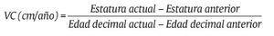 Velocidad de crecimiento. Se refiere a la tasa de crecimiento de un individuo en un determinado lapso de tiempo y no se puede utilizar en una sola vez70. Requiere de dos mediciones con intervalos no menores de tres meses y no mayores de 18 meses. La velocidad de crecimiento se considera normal cuando se ubica al niño y/o adolescente entre los percentiles 10 y 90. Para el cálculo se utiliza la siguiente fórmula: