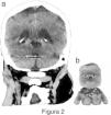 Figura 2 (a) Superposición de imágenes donde se aprecia el rostro del personaje Chubaca de la película Star Wars. En el plano coronal de la TC sin contraste se percibe la cara formada por las astas posteriores de los ventrículos laterales y los plexos coroideos (representando los ojos), la cisterna cerebelosa superior (que forma la nariz) y el cuarto ventrículo (asemejándose a la boca). (b) Oso de peluche de Chubaca.