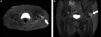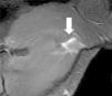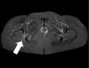 Desgarro del músculo cuadrado crural y síndrome isquiofemoral derecho. La secuencia ponderada en STIR, plano axial, revela un edema interfibrilar a nivel del músculo cuadrado crural (flecha). También se visualiza un ligero acortamiento del espacio entre la tuberosidad isquiática y el trocánter menor en el lado derecho, en comparación con el contralateral.