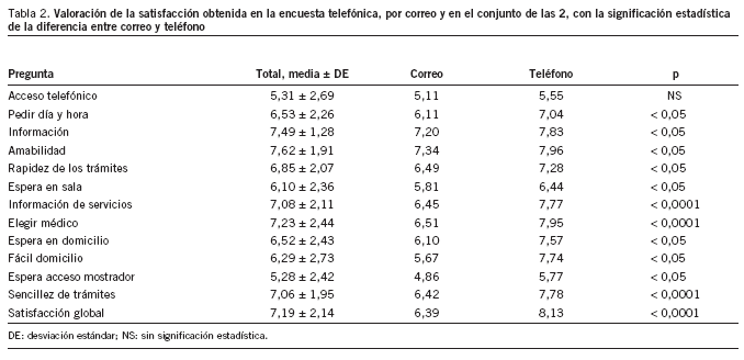 La comparación de los resultados obtenidos por correo y por teléfono muestra diferencias significativas en todos los ítems, salvo en accesibilidad telefónica (que tiene la valoración más baja en ambas técnicas). En la encuesta telefónica se obtienen resultados de satisfacción más altos. Incluso el ítem sin diferencias significativas obtuvo puntuación más alta en la telefónica que en la postal. Todos los resultados cuantitativos se presentan en la tabla 2.