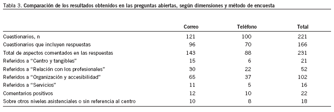 Se recogieron 96 respuestas en la encuesta postal, con un total de 143 aspectos a mejorar identificados. Así, el número de aspectos identificados por cada cuestionario contestado (143/121) ha sido de 1,2. En cuanto al teléfono, 70 entrevistados hacían comentarios e identificaban 88 aspectos. En este caso, el número de aspectos por cuestionario contestado es de 1,26. En la tabla 3 se puede ver cómo se distribuyen los aspectos comentados en las dimensiones en las que se agruparon.