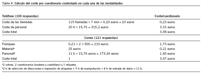 Por lo que se refiere a eficiencia, la encuesta telefónica tuvo un coste por cada cuestionario completado de 3,38 euros y la postal, de 3,37 euros. La tabla 4 muestra el desglose de conceptos.