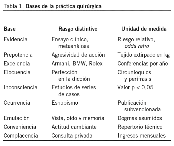 Estas formas de práctica quirúrgica, criticables bajo el prisma de la falta de evidencia, no son en absoluto desdeñables, por cuanto que su arraigo es importante en el ejercicio cotidiano y, en gran medida, el estado actual de la cirugía deriva de ellos.