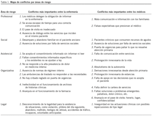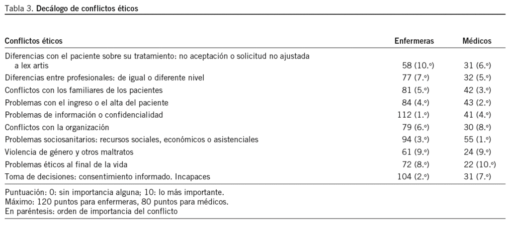 En enfermería, se identificaron 59 conflictos o dilemas. De entre todos ellos, 16 resultaron tener mayor importancia (frecuencia + evidencia + consistencia >= 5 puntos): 4 dilemas en el área profesional, 2 en la social, 3 en la asistencial, 6 en la organizativa, y uno en la legal. Entre los médicos, se identificaron 47, de lo que 14 eran los de mayor importancia: 2 dilemas en el área profesional, 3 en la social, 3 en la asistencial, 5 en la organizacional y uno en la legal (tabla 1).