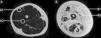 Variabilidad en el tamaño y posición del ROI: el reemplazo graso no suele darse como un aumento difuso de la señal del músculo afectado. Muy por el contrario, el cambio en resonancia suele verse tanto como áreas de músculo con señal relativamente normal que se alternan con tractos adiposos de alta señal, como áreas grises, más uniformes de límites variados, cambios que con frecuencia son progresivos (fig. 4). La elección de un ROI de pequeño tamaño, en forma aislada, puede determinar la elevación o normalización de la señal en un rango que puede llegar hasta el 80%, dependiendo la posición respecto de la presencia de áreas relativamente más preservadas o áreas de franca infiltración (fig. 5). La selección de múltiples mediciones en una misma área o de un área que se acerque a los límites del músculo permite dar cuenta, en una medida promedio, de la coexistencia de tractos fibrosos de diferente calibre y de fibras musculares preservadas. Al evaluar la diferencia entre realizar varias mediciones pequeñas y una medida que abarque el total del músculo, no existieron diferencias significativas entre el promedio aritmético de los valores de los 5 ROI pequeños y el valor de un ROI del área de sección para 107 músculos por paciente (p=0,0749).
