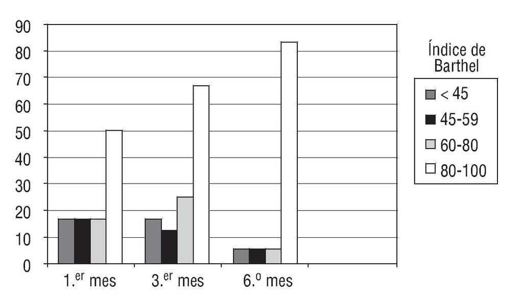 Durante el primer mes, encontramos a un paciente con un grado de dependencia importante en alimentación, control de esfínteres y deambulación, lo cual condiciona su destino al alta debido a los recursos asistenciales necesarios.