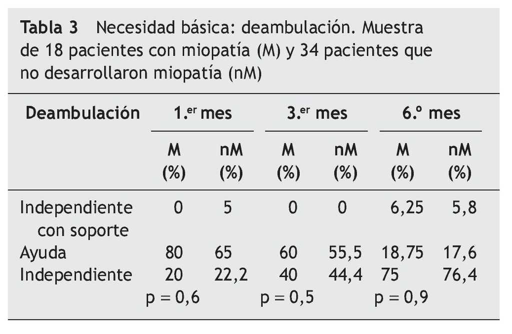 No se ha encontrado diferencias significativas con el grado de dependencia funcional entre el grupo afectado de miopatía y el grupo no afectado de miopatía partir del 3.er mes.