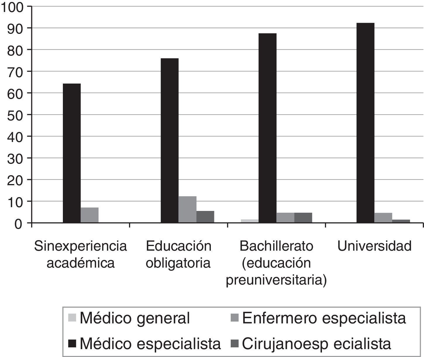 El 80% de la población encuestada (Q1) reconoció al anestesiólogo como médico especialista. Durante el análisis comparativo entre las variables demográficas se apreció una tendencia a contestar correctamente en función del nivel de estudios (fig. 1). Al ser eliminados del análisis las respuestas apenas contestadas («médico general» y «cirujano con formación especializada») se obtuvo un 94% de respuestas correctas entre la población universitaria o preuniversitaria, mientras que el 29% de los que no tienen experiencia académica afirmaron no saber la respuesta (p<0,01).