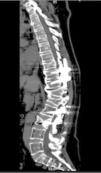 Tomografía computarizada de columna vertebral, corte sagital, en la que se evidencian tornillos transpediculares en vértebras torácicas 10 – 11 y lumbares L2 – L3; hipercifosis residual a nivel de fractura por acuñamiento en los cuerpos vertebrales T12-L1; disminución de la altura del cuerpo vertebral L3; espondilosis de columna torácica y lumbar y disminución de la matriz ósea.