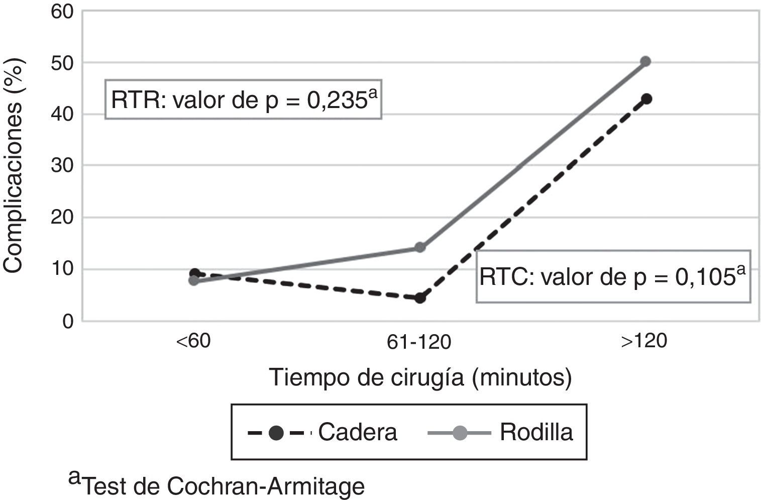 Al evaluar si el número de complicaciones posquirúrgicas se relacionaba con mayor tiempo quirúrgico, no se encontró suficiente evidencia en los dos tipos de reemplazos (p <0,05). Sin embargo, los datos muestran una tendencia de un aumento del porcentaje de complicaciones a medida que aumenta el tiempo quirúrgico (fig. 2).