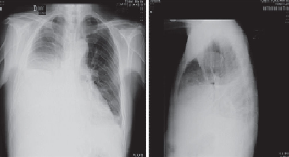 Radiografías de tórax proyecciones PA y lateral, en las que se observa radioopacidad completa de los dos tercios inferiores del hemitórax derecho con borramiento del contorno diafragmático y cardiaco de este lado y desviación del cardiomediastino hacia la izquierda, por derrame pleural. Mala definición del ángulo costofrénico lateral izquierdo probablemente por escaso derrame pleural de este lado.