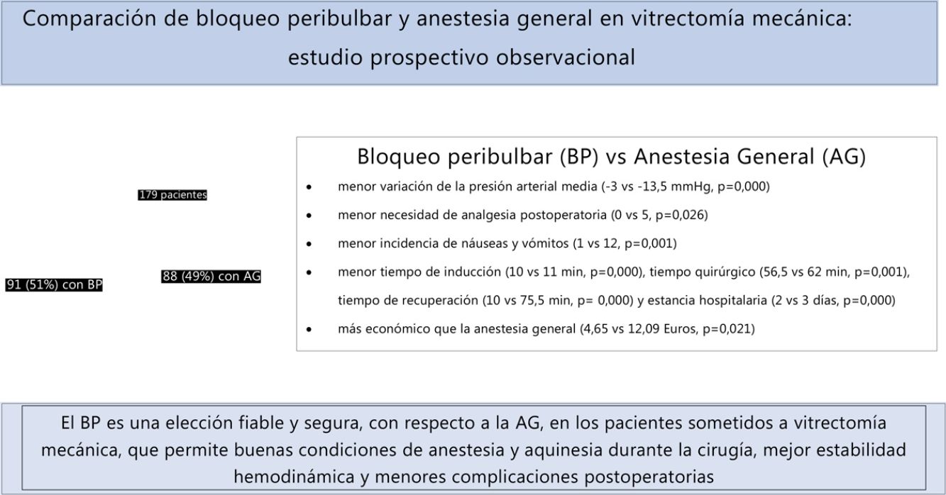 ConclusiónEl bloqueo peribulbar es una alternativa segura a la anestesia general para pacientes sometidos a vitrectomía, especialmente pacientes mayores y aquellos con más comorbilidades.
