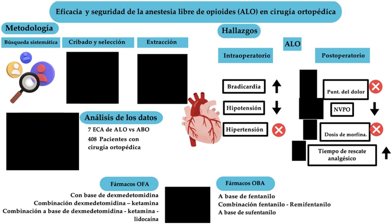 La anestesia libre de opioides (ALO) está cada vez más reconocida como enfoque perioperatorio que puede ofrecer control efectivo del dolor con reducción del riesgo de efectos adversos. Considerando que las cirugías ortopédicas causan dolor postoperatorio moderado, al menos, evaluamos la efectividad y la seguridad de la ALO en procedimientos ortopédicos.