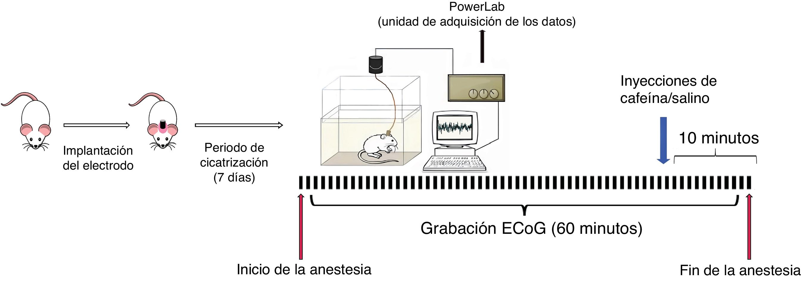 Se dividieron aleatoriamente ratas macho Sprague-Dawley (n=16) en 2 grupos: control (salino) y cafeína (75mg/kg). Tras la implantación de un electrodo tripolar, situamos a las ratas en una cámara de inducción de la anestesia, registrándose la actividad de onda electrocorticográfica cerebral. Se indujo la anestesia con sevoflurano al 4% (4l/min O2) durante 5min y, una vez que las ratas estuvieron dormidas, se redujo la concentración de sevoflurano al 3% (4l/min O2) para mantener la anestesia. Se inyectó suero salino o cafeína intraperitonealmente, 10min antes de interrumpir la anestesia. Tras finalizar el sevoflurano, se retiró a las ratas de la cámara y se observaron y anotaron la frecuencia respiratoria, la respuesta a la sujeción de la cola y el reflejo (emergencia total). Se calcularon la frecuencia y amplitud de las ondas theta y delta (desde el valor basal) y la frecuencia de las oscilaciones theta a partir de los registros electrocorticográficos.