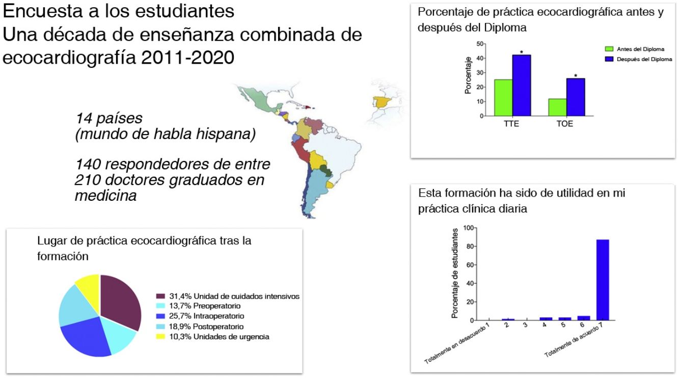 Methods and resultsA questionnaire was emailed to all medical doctors who graduated from the blended learning diploma in echocardiography developed by the University of Chile and taught by a team from Chile and Spain. One hundred and forty of the 210 students who graduated from the program between 2011 and 2020 completed the questionnaire: 53.57% were anaesthesiologists, and 26.42% were intensivists. More than 85% of respondents indicated that the online teaching met their expectations, and 70.2% indicated that the hands-on practice fulfilled the stated objectives. In a retrospective analysis using self-reported data, graduates reported that their use of transthoracic and transoesophageal echocardiography has increased from 24.29% to 40.71% and from 13.57% to 27.86%, repectively, after the programme compared to before the programme. They used echocardiography mainly in the perioperative period (56.7%) and during intensive care (32.3%), while only 11% of respondents used it in emergency care units. Nearly all (92.4%) respondents reported that the skills learned was very useful in their professional practice.