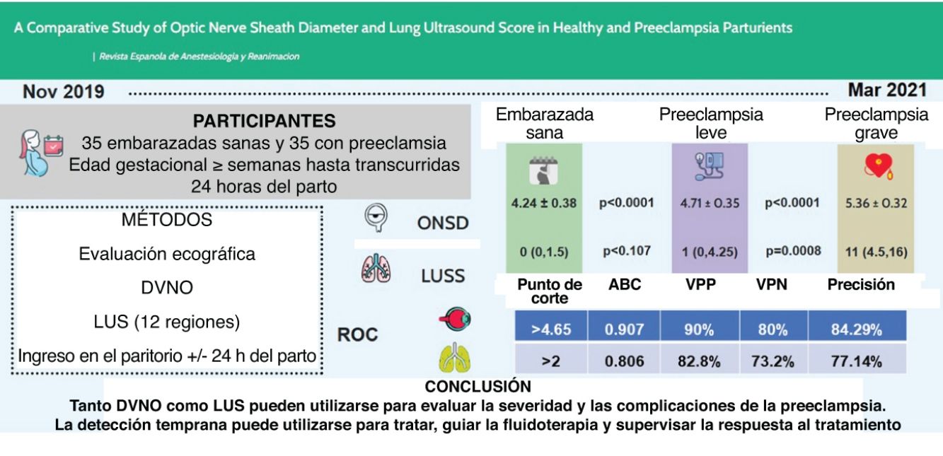 Las complicaciones de la preeclampsia incluyen edema cerebral y pulmonar, que están fuertemente correlacionados con el diámetro de la vaina del nervio óptico (DVNO) y la puntuación Lung Ultrasound Score (LUS), respectivamente. Este estudio fue realizado para comparar el DVNO y el LUS en parturientas sanas y mujeres con preeclampsia.
