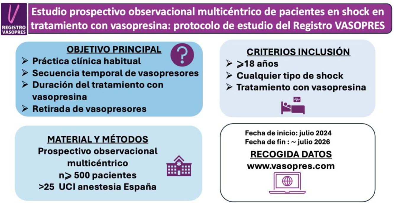 Materials and methodsThe VASOPRES Registry is a prospective multicentre observational study, in which critical care anaesthesia units from all over Spain will participate, collecting data on patients over 18 years of age in whom treatment with vasopressin is initiated, regardless of the type of shock they present. The duration of the study is estimated at 24 months, starting from its approval by the Clinical Research Ethics Committee (CEIm).