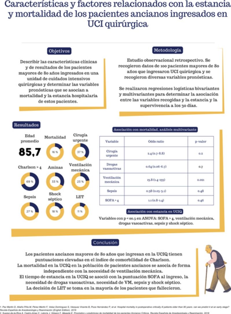 ConclusionesLa ventilación mecánica es el principal predictor de mortalidad en mayores de 80 años en UCIQ. La sepsis y el soporte vasoactivo prolongaron la estancia hospitalaria. Las decisiones de LET son frecuentes, aunque sin predictores claros para su aplicación.