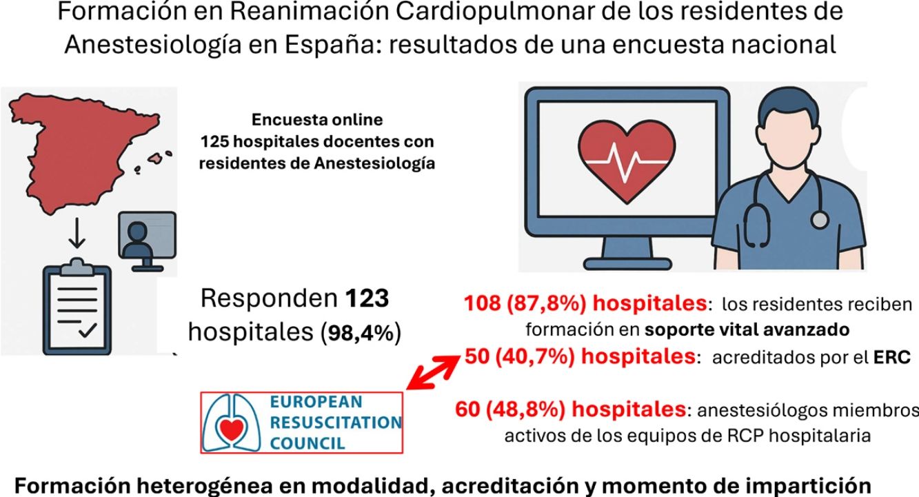 ConclusionesAunque la mayoría de los hospitales imparten formación en RCP, persisten desigualdades importantes. Es prioritario avanzar hacia una formación acreditada, continua y basada en simulación, así como aumentar la participación de los servicios de anestesiología en la RCP hospitalaria para mejorar la preparación clínica de los residentes y la seguridad del paciente.