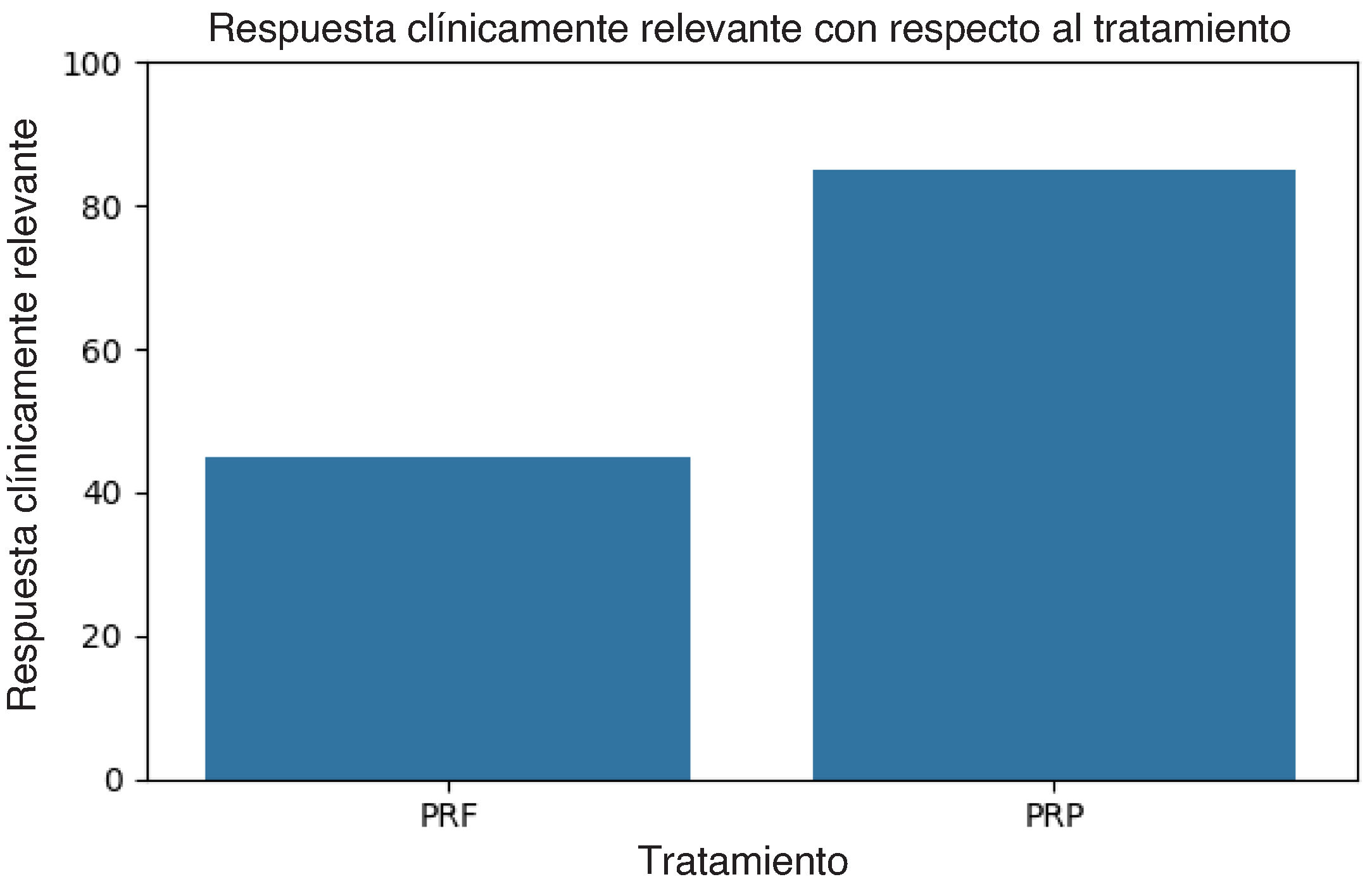 ResultadosAmbos grupos mostraron mejoría del dolor y de la función. No se observaron diferencias significativas de las puntuaciones de EVA entre los dos grupos. El grupo de PRP presentó mejores resultados funcionales (ODI) en comparación con el grupo PRF, con una disminución de −9,6 puntos en comparación con −5,4 (p=0,018), presentando mejoría clínica relevante (>30% en ODI) en el 85% de los casos respecto al 45% (p=0,02).