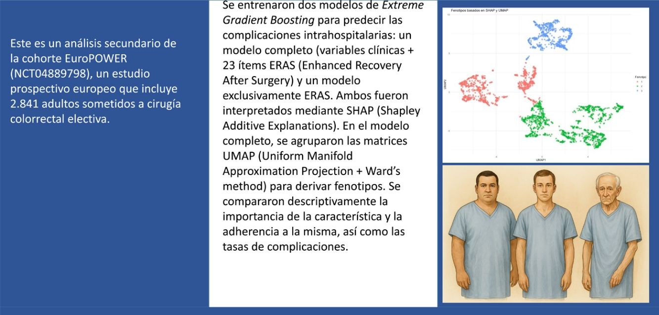 Los protocolos Enhanced Recovery After Surgery (ERAS) mejoran los resultados tras la cirugía colorrectal, pero la adherencia sigue siendo variable y puede interactuar con el riesgo del paciente. Las puntuaciones tradicionales de cumplimiento carecen de granularidad para explorar dichas dinámicas. Nuestro objetivo fue utilizar el aprendizaje automatizado (machine learning) interpretable para cuantificar la contribución de los ítems individuales de ERAS y las características clínicas a las complicaciones postoperatorias, e identificar los fenotipos ERAS impulsados por los datos.