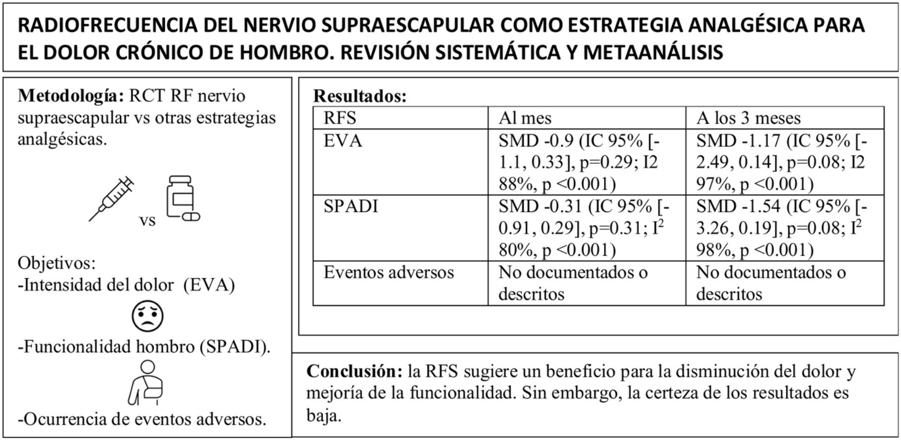 MétodosSe realizó una revisión sistemática de la literatura en Medline, Embase y Central buscando ensayos clínicos que compararan la radiofrecuencia del nervio supraescapular con otras estrategias incluido placebo e incluyeran como resultado principal la intensidad del dolor medida en una escala visual análoga, la funcionalidad por un índice de dolor y discapacidad del hombro (SPADI) y cuantificaran la ocurrencia de eventos adversos. Se analizó el riesgo de sesgo mediante la herramienta RoB2 de Cochrane. Se analizó la evidencia mediante un modelo de efectos aleatorios y se cuantificó la heterogeneidad mediante la prueba del I2.