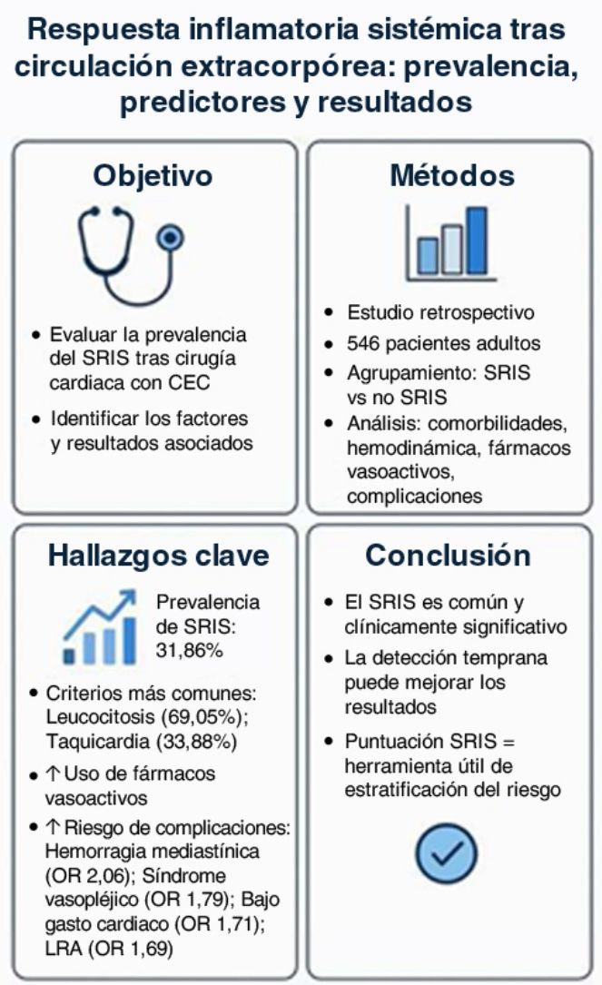 ConclusiónEl SRIS es una condición prevalente y clínicamente relevante tras cirugía cardiaca en el periodo postoperatorio. El puntaje de SRIS constituye una herramienta valiosa para la estratificación del riesgo. La identificación temprana y las intervenciones dirigidas podrían mejorar los resultados clínicos. Se requieren estudios prospectivos adicionales para perfeccionar los modelos predictivos y las estrategias terapéuticas.