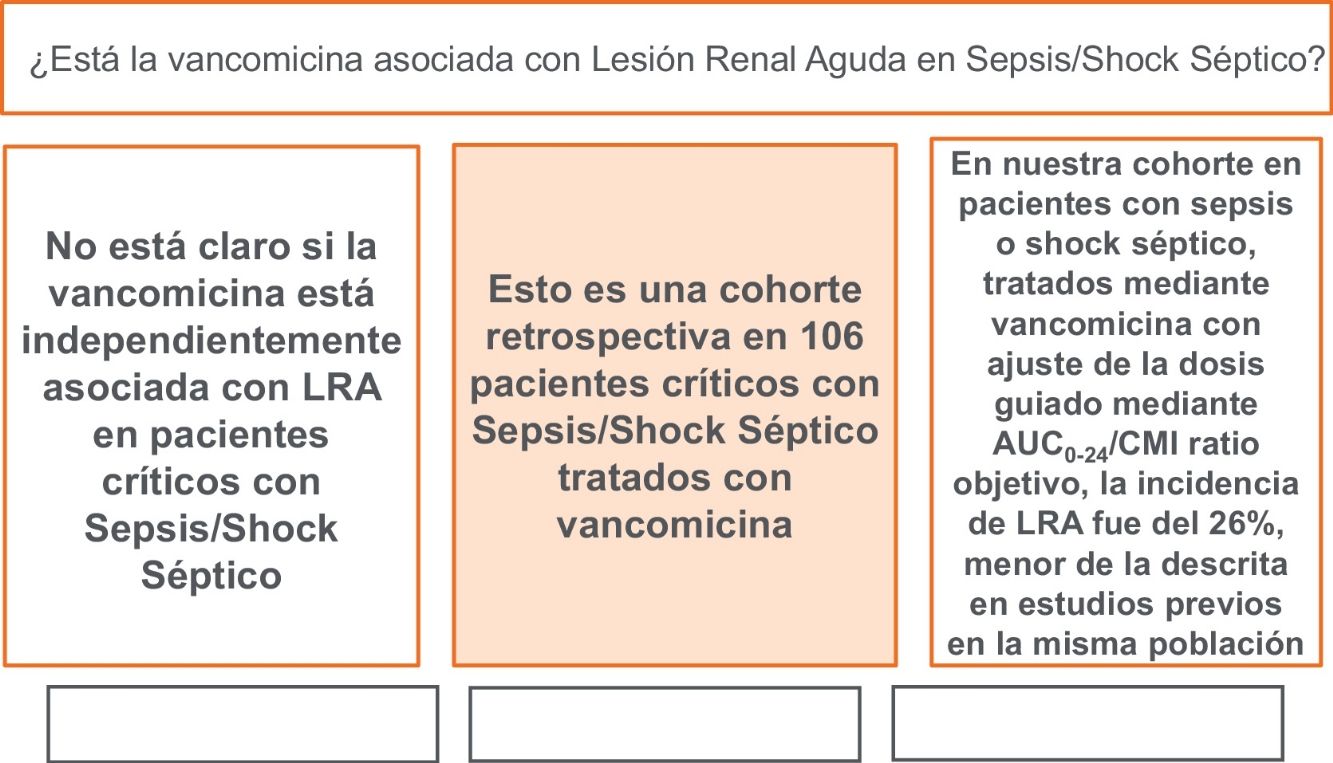 En nuestra cohorte retrospectiva en pacientes críticos con sepsis o shock séptico, tratados mediante vancomicina con ajuste de la dosis mediante la monitorización farmacocinética/farmacodinámica para conseguir la AUC0-24/CMI objetivo, la incidencia de LRA ha sido del 26%.