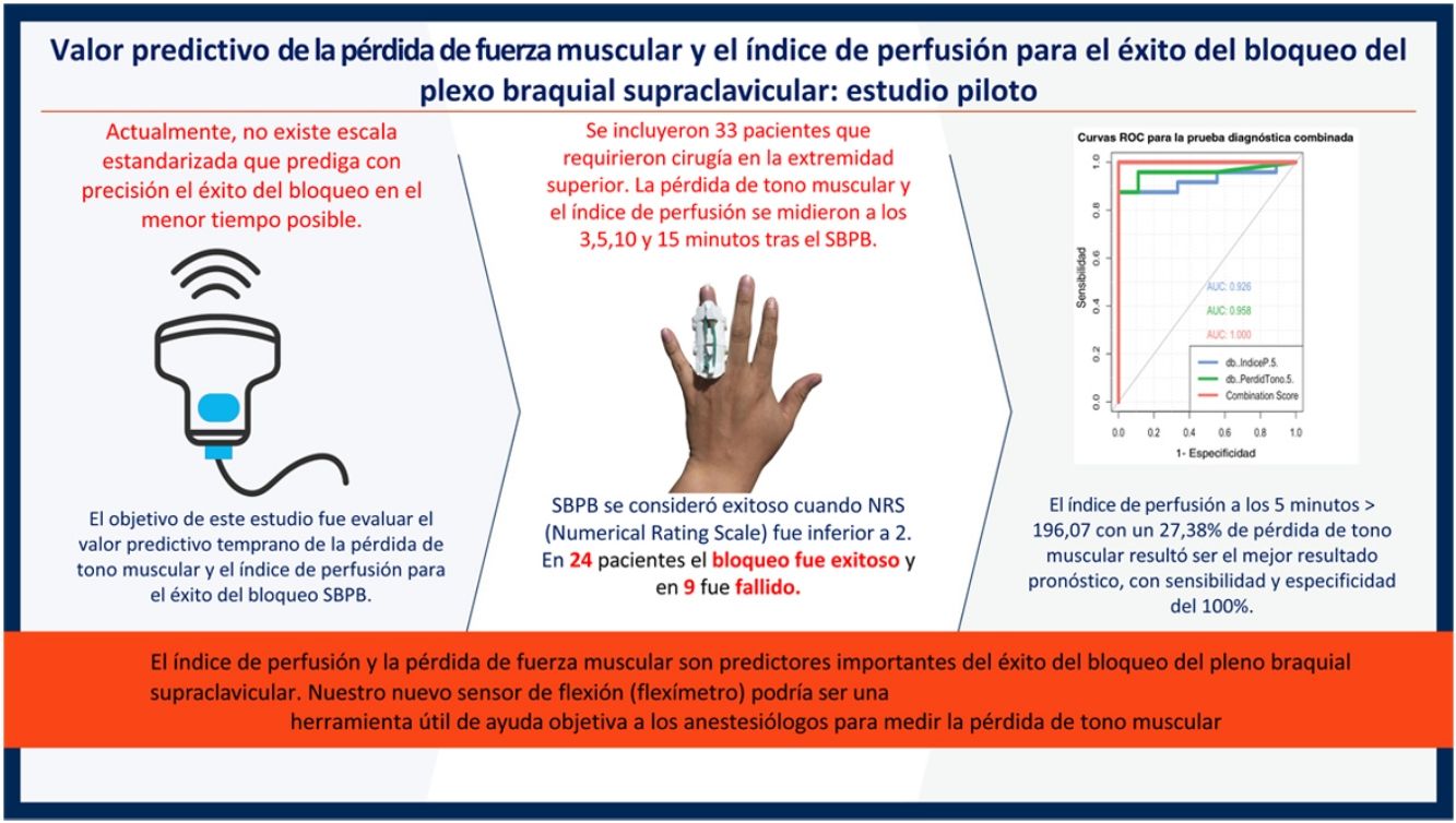 Actualmente, no existe ninguna herramienta estandarizada que prediga con precisión el éxito del bloqueo del plexo braquial supraclavicular (SBPB) en el menor tiempo posible. El objetivo de este estudio fue evaluar el valor predictivo temprano de la pérdida de tono muscular y el índice de perfusión para predecir el éxito del SBPB. Se trata del primer estudio que reporta el uso de este dispositivo para la evaluación objetiva del éxito del bloqueo nervioso.