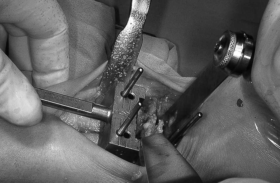 Seguidamente, se coloca la guía de corte astragalino en los mismos clavos anclados en la tibia y se introducen por los orificios marcados con «0». A continuación se coloca el pie en ángulo recto hasta contactar el cuello del astrágalo con la guía de corte astragalina y se introducen dos clavos en el cuerpo, paralelos a los homólogos de la tibia, pero por la parte inferior y lateral del cajeado que dicha guía dispone. Debe comprobarse este tiempo mediante el intensificador de imágenes. Cada guía de corte astragalina se corresponde con el tibial en el mismo tamaño. Posteriormente se retiran ambas guías de corte y se comprueba su colocación correcta con el intensificador de imágenes para, a continuación, hacer el corte astragalino, sirviendo como guía a modo de «carriles» los dos clavos inferiores. Seguidamente se retira el fragmento óseo astragalino obtenido (fig. 3) y se comprueba la exactitud del corte.
