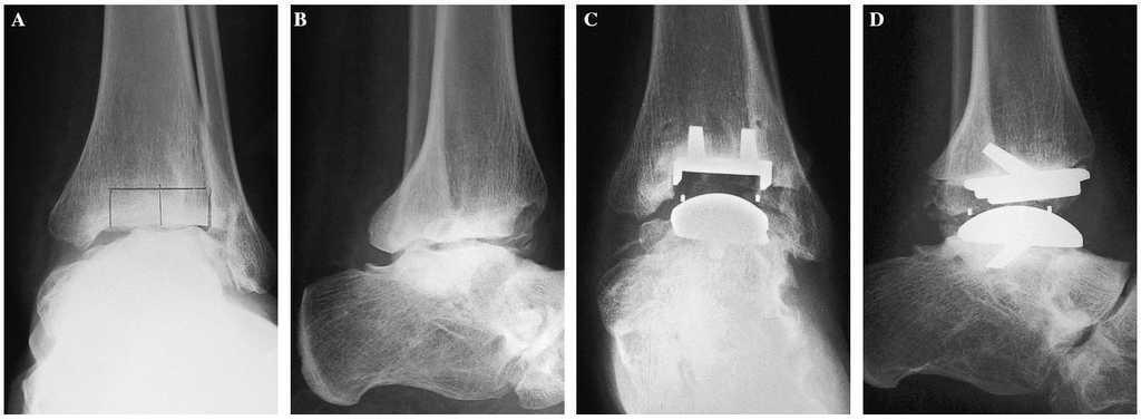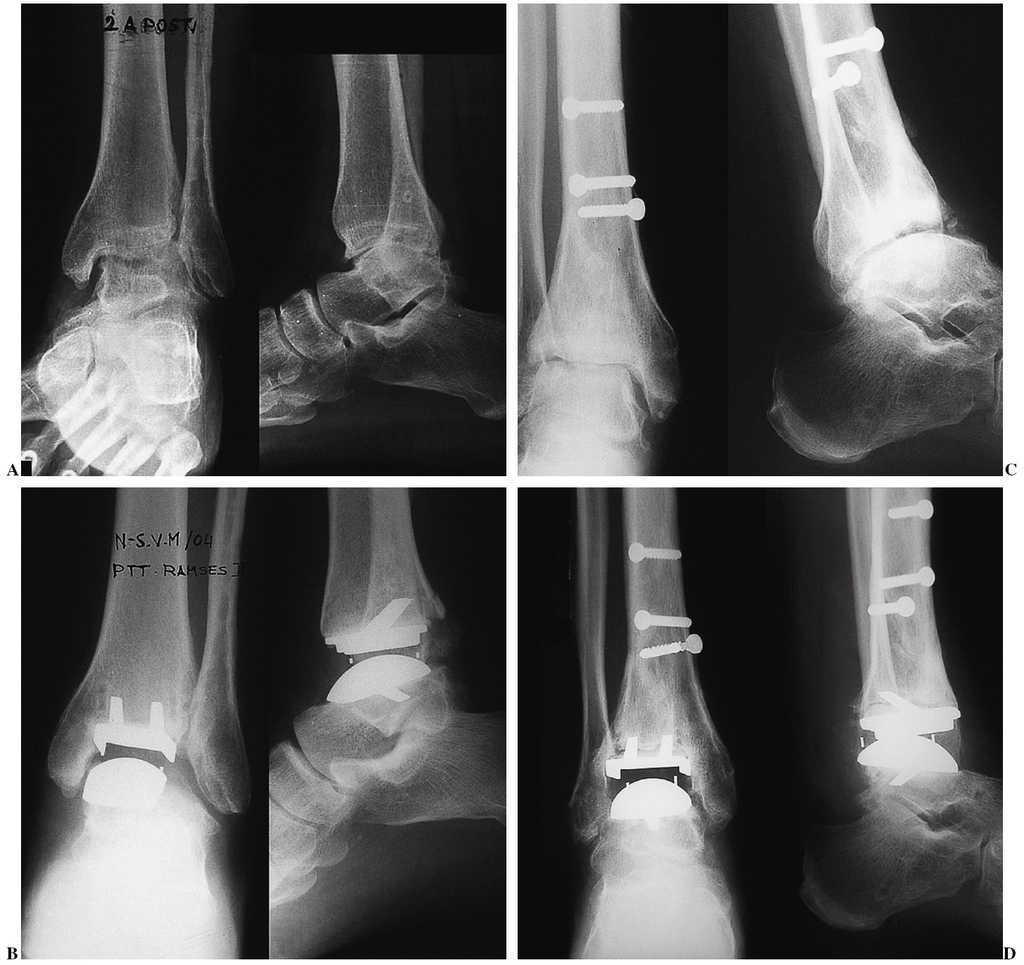Figura 8. Indicación excepcional. Paciente de 41 años con secuelas de un pie equinovaro congénito. Artrodesis fallida de tobillo. Anquilosis dolorosa. Grados de movilidad: 10°. Radiografías preoperatorias anteroposterior (A) y lateral (B). Control postoperatorio: radiografía anteroposterior (C) y lateral (D). Arco de movilidad de 40°, no doloroso.
