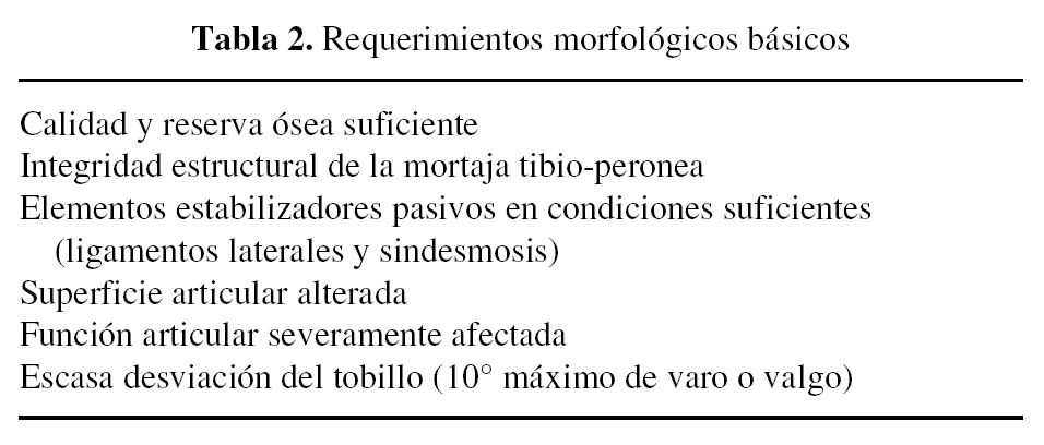El hecho de que los diseños protésicos actuales respeten una parte importante de la reserva ósea del pilón tibial, maléolos y astrágalo, exige igualmente la existencia de una integridad de ligamentos en tamaño y calidad suficientes, para que la función estabilizadora sea asumida no sólo por la prótesis sino también por estas estructuras pasivas. Los requerimientos básicos necesarios se han resumido en la tabla 2.