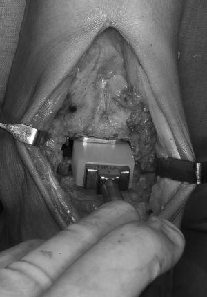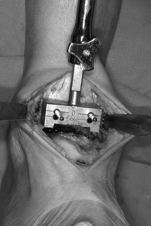 Se termina el corte tibial y se retira el fragmento óseo correspondiente, completando el cajeado con un escoplo específico que se adapta a la guía de corte tibial. En este tiempo pueden ser lesionados el tendón de Aquiles y el tendón del flexor propio del primer dedo. Una vez retirado el fragmento óseo y comprobado el cajeado, debe resecarse con una pinza gubia las superficies óseas limítrofes del astrágalo con ambos maléolos. La movilidad completa de la prótesis dependerá de que quede libre en 3 ó 4 mm el espacio talo-maleolar externo e interno.