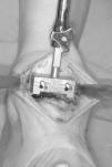 Figura 3. Corte astragalino. La sierra se desliza por los dos clavos guía alojados en el cuerpo del astrágalo. El corte debe ser plano para permitir la correcta adaptación de la superficie del componente astragalino.