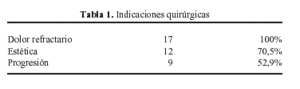 Las indicaciones para tratamiento quirúrgico fueron (tabla 1): Dolor refractario en 17 casos (100%), estética inaceptable en 12 casos y progresión de la curva en 9 ocasiones. En 2 pacientes (casos 11 y 17) con deformidad leve de 52° se estableció la indicación quirúrgica en base al dolor refractario, pese al tratamiento conservador, y la rigidez de la curva. Ambos pacientes eran esqueléticamente maduros, y aceptaban muy mal su deformidad. Además el caso 17 se trataba de una cifosis toracolumbar especialmente antiestética. Todos los pacientes habían sido tratados, previamente a la cirugía, con corsés anticifosantes.