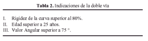 Los criterios para realizar el doble abordaje, fueron los siguientes: rigidez de la deformidad (todos los casos) superior al 80% del valor angular de inicio medido en la prueba de flexibilidad; edad del paciente superior a los 25 años (5 casos), y valores angulares superiores a 75° en progresión (3 casos) (tabla 2).