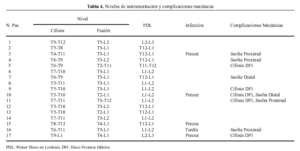 En este trabajo, las complicaciones mecánicas no se han correlacionado de forma significativa con la cifosis inicial, el empleo de doble vía o sólo vía posterior, ni con el tipo de instrumentación.