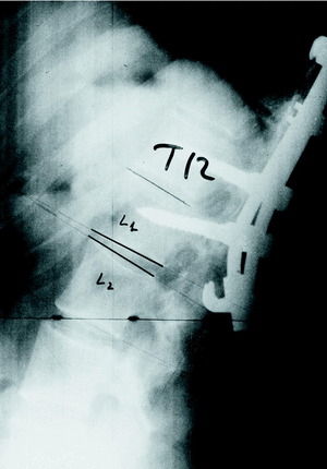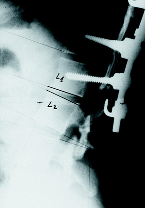 Figura 2. Paciente n.o 9. La instrumentación distal se extendió sólo hasta L1; no se incluyó en la osteosíntesis el PDL. Se aprecia cifosis del espacio L1-L2.