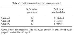 En la cohorte histórica, los 113 pacientes fueron transfundidos con sangre alógena y 8 pacientes de la cohorte actual han necesitado transfusión alógena.