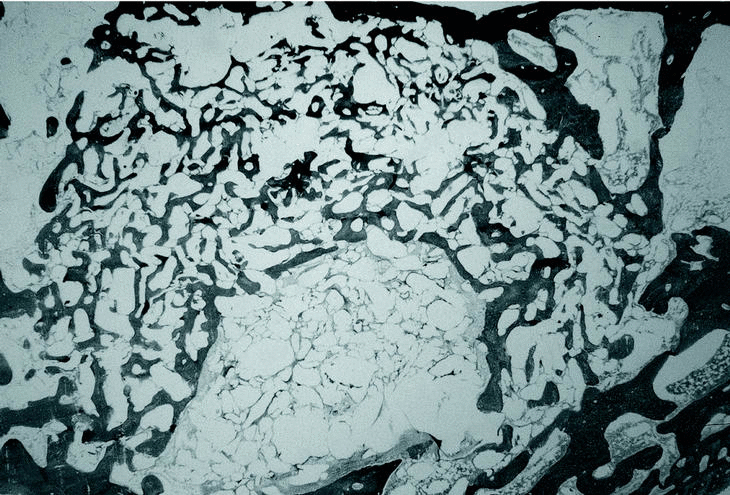 Las mediciones de los datos histomorfométricos se efectuaron de forma semicuantitativa obteniendo los siguientes parámetros: superficie de implante, profundidad de crecimiento trabecular intraimplante, área trabecular total, área del implante ocupada por trabéculas y área de polímero no reabsorbido. Para la valoración radiológica hemos utilizado la escala de Lane y Sandhu22 para conocer el porcentaje de formación ósea en el defecto a las 12 semanas.