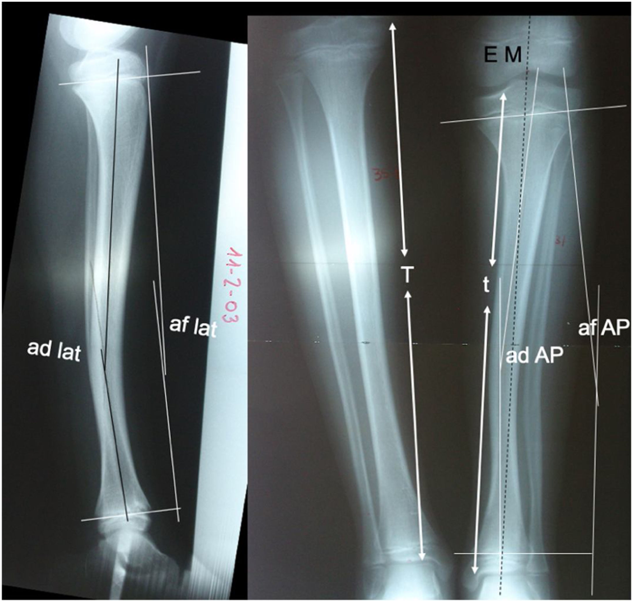 ad AP: ángulo diafisario tibial en proyección anteroposterior; ad lat: ángulo diafisario tibial en proyección lateral; af AP: ángulo fisario en proyección anteroposterior; af lat: ángulo fisario en proyección lateral; EM: eje mecánico de la extremidad; T: longitud de la tibia sana; t: longitud de la DPMT.