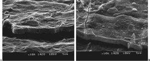 Figura 3. Zonas de falta de unión entre el fosfato de calcio y el substrato (A) y (B). Se pueden observar grietas en la superficie de fosfato de calcio.