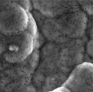Figura 4. Colonización bacteriana en la capa de fosfato de calcio.