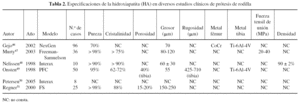 Una revisión de las especificaciones de la HA en diferentes implantes utilizados en algunos estudios clínicos muestra que existen diferencias entre ellas pero, especialmente, que muchos estudios no citan estas características (tabla 1). Todos los estudios citados en la tabla se refieren a implantes recubiertos por plasma spray, aunque la mayoría no especifican si se realiza en aire o al vacío. Las diferencias en las especificaciones de la HA entre los implantes son muy difíciles de correlacionar con sus resultados clínicos, puesto que son muchos los factores que intervienen. Los estudios clínicos en implantes de cadera superan ya los 10 años, con un número de estudios más extenso que en implantes de rodilla (tabla 2) y tobillo (tabla 3).
