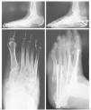 La pseudoartrosis es una complicación que puede ocurrir, especialmente en los primeros estadios del pie de Charcot, cuando el hueso es blando. Incluso con las mejores técnicas de fijación, el 15% de los pacientes desarrollarán una pseudoartrosis en una o más articulaciones, algunas de las cuales serán asintomáticas. El porcentaje es mayor en fumadores y en pacientes con hueso avascular. Si se rompen los tornillos se tiene que proceder a la revisión de la artrodesis y del alineamiento, empleando tornillos percutáneos adicionales y, posiblemente, injerto (fig. 3). Si los tornillos se rompen y no causan prominencias óseas, no hace falta una nueva cirugía. Se puede tolerar un grado moderado de consolidación en mala posición, y si no causa lesiones por presión con el calzado, no es necesaria la revisión. En caso contrario se debe reintervenir al paciente. A veces se puede realizar una manipulación para mejorar la posición del pie, retirar uno o más tornillos colocados anteriormente e introducir otros más largos y resistentes. Así no se vuelven a disecar las partes blandas y, si la revascularización ha ocurrido en esa área, la curación tendrá lugar en un tiempo razonablemente rápido.